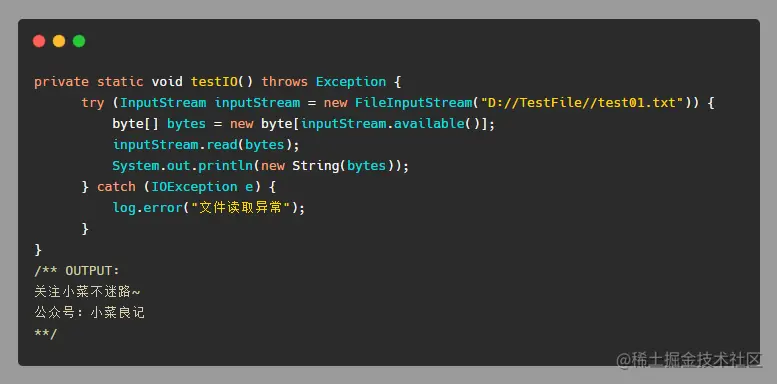 我们得借助一个 byte 数组来接收读取到值,然后转为字符串类型。