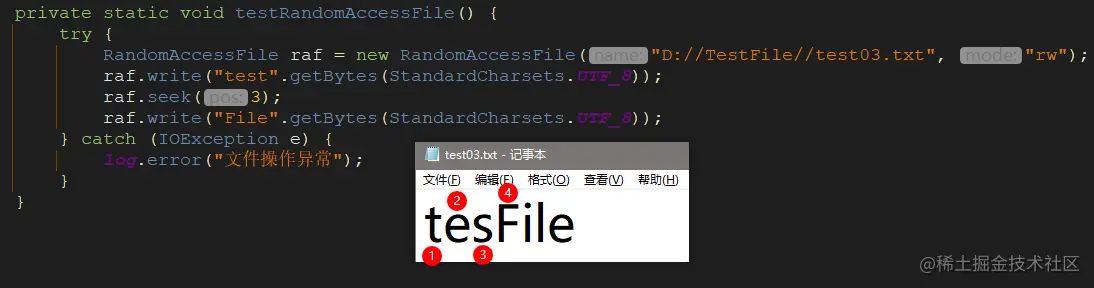 我们首先从向文件中写入了test 四个单词,然后将头指针移动3位后继续写入File四个单词,结果就变成了testFile,这是因为移动指针后是以第四个位置开始写入。