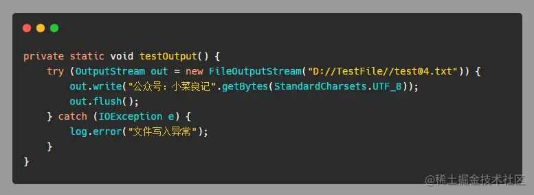 输出流中又分为 字节输出流(OutputStream) 和 字符输出流(Writer),任何由 OutputStream 或 Writer 派生而来的类都实现了 write() 这个方法,用来写入单个字节或字节数组。