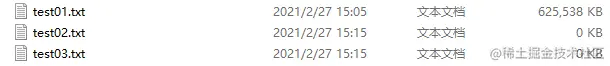 现有三个文本文件,其中test01.txt 大小约为 610M,test02/test03均为空文本文件