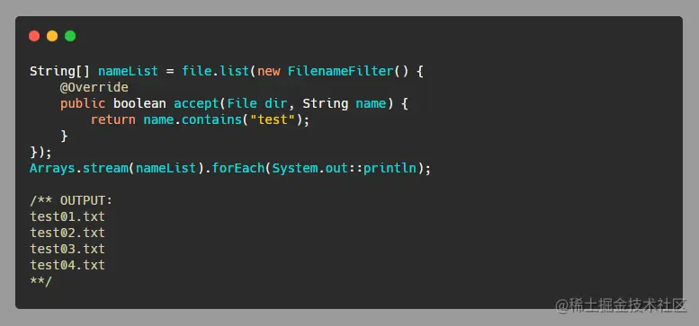 同样是一个接口,同样需要重写 accept() 方法,但是这个方法只有一个 File 的参数。因此这两个参数都是用于文件过滤的,功能大同小异~
