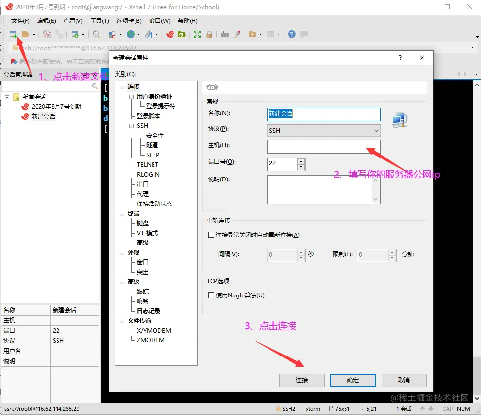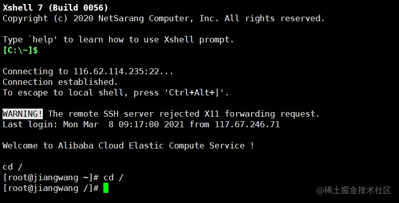 3、下载 xShell 工具,进行远程连接使用!连接成功效果如下: