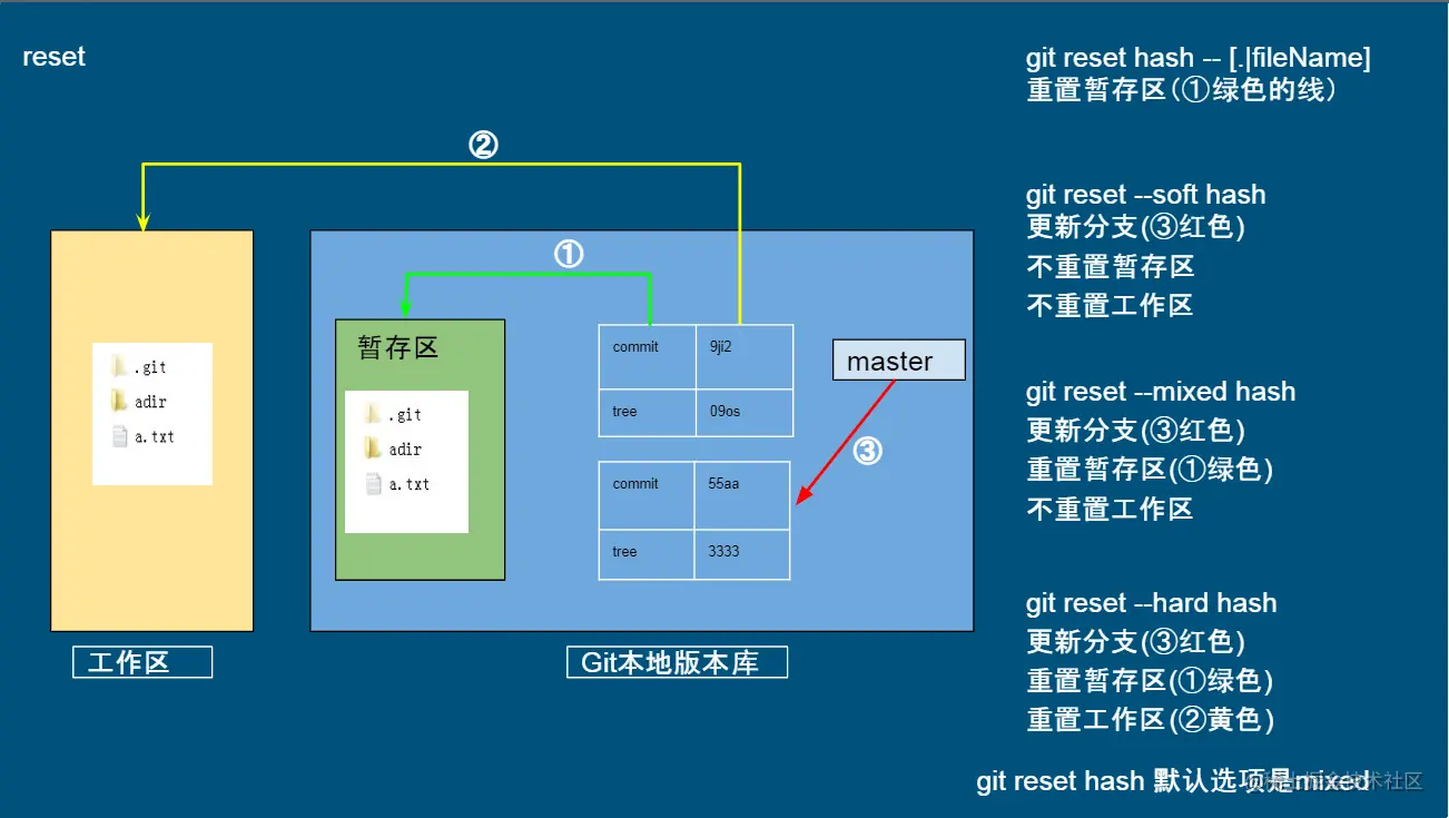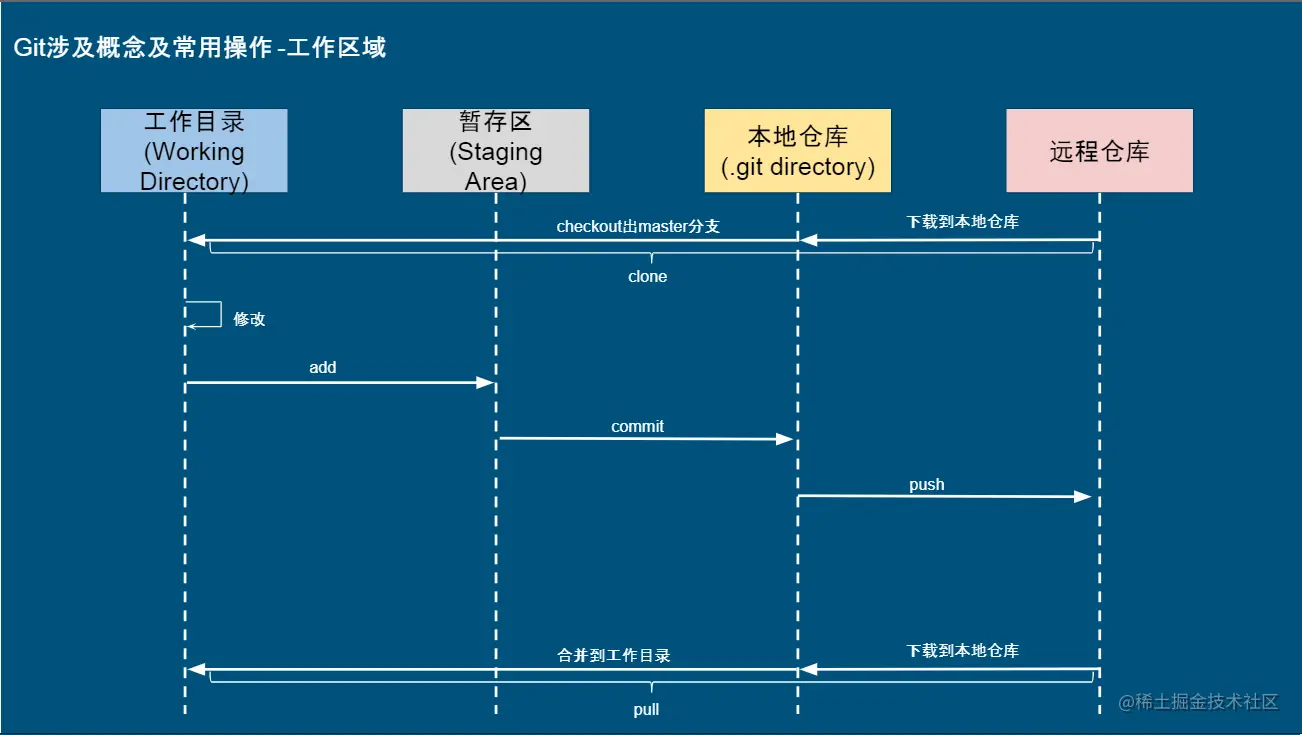 首先,我们要搞清楚,git的4个存储区域,分别是工作区,暂存区,本地仓库,远程仓库(图中无体现)。