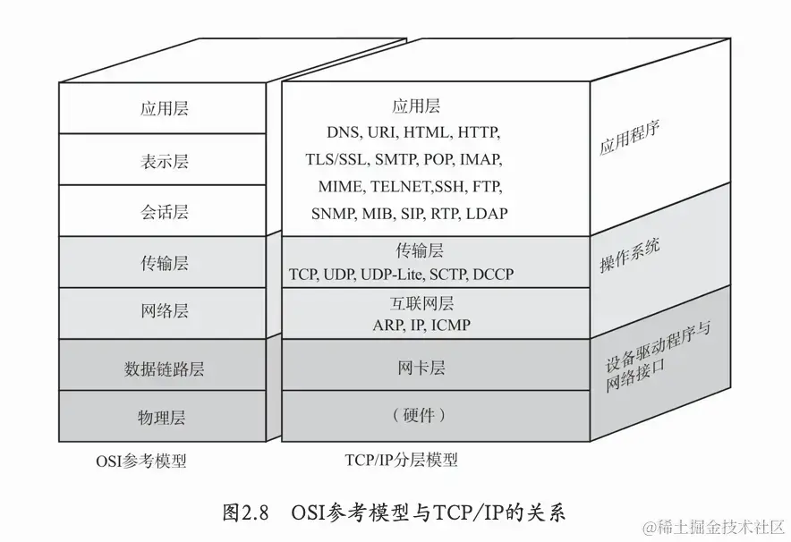 网络有两种分层模型,一种是ISO(国际标准化组织)制定的OSI(Open System Interconnect)模型,它将网络分为七层。一种是TCP/IP的四层网络模型。OSI是一种学术上的国际标准,理想概念,TCP/IP是事实上的国际标准,被广泛应用于现实生活中。两者的关系可以看这个图: