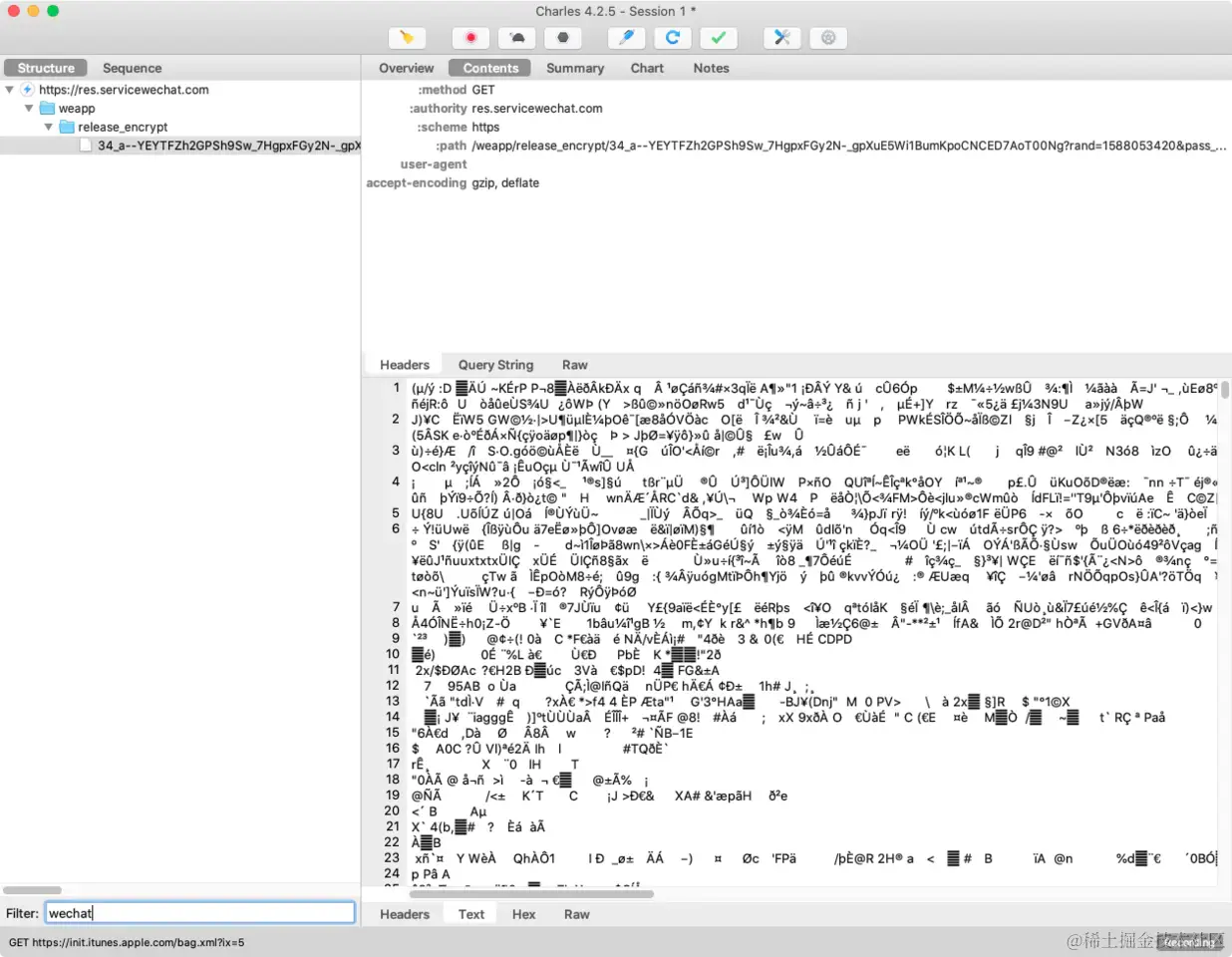 我在聊天过程中并没有抓到会话的请求,在小程序启动的时候到是抓到了一个加密内容。我手动触发该链接会下载一个加密文件,我猜测这种加密是内容层面的加密,它的解密是由客户端完成的,而不是在HTTPS建立过程完成的。