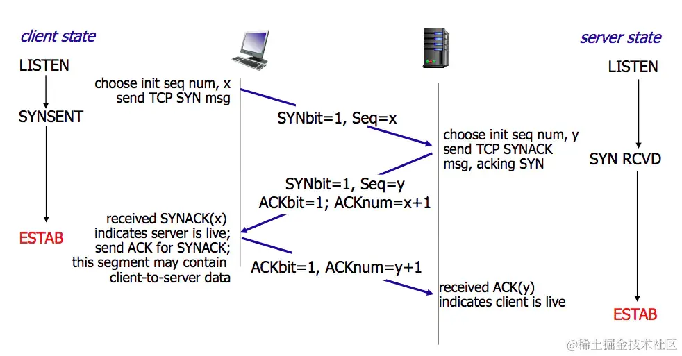 2、第二次握手(SYN=1, ACK=1, seq=y, ACKnum=x+1)