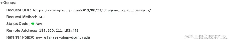 这里标记了请求的URL,请求方法为GET。状态码为304,代表文件未修改,可以直接使用缓存的文件。远程地址为185.199.111.153:443,此IP为Github 服务器地址,是因为我的博客是部署在GitHub上的。