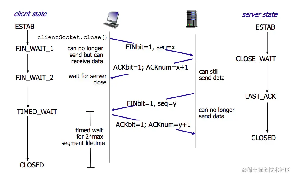 客户端等待了某个固定时间(两个最大段生命周期,2MSL,2 Maximum Segment Lifetime)之后,没有收到服务器端的 ACK ,认为服务器端已经正常关闭连接,于是自己也关闭连接,进入 CLOSED 状态。