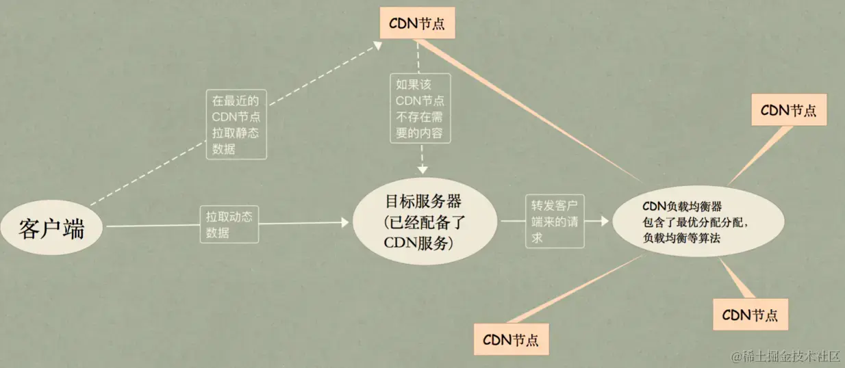 一个用户访问某个静态文件(如CSS),这个静态文件的域名假如是www.baidu.com,而这个域名最终会被指向CDN全局中CDN负载均衡服务器,再由这个负载均衡服务器来最终分配是哪个地方的访问用户,返回给离这个访问用户最近的CDN节点。之后用户就直接去这个CDN节点访问这个静态文件了,如果这个节点中请求的文件不存在,就会再回到源站去获取这个文件,然后再返回给用户。