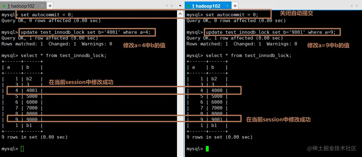 操作不同行时:即使上一个事务修改未提交,第二个事务也能修改,互不影响。