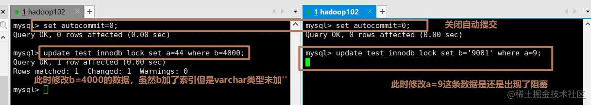 修改 test_innodb_lock 中的数据,varchar 不用 ’ ’ ,导致系统自动转换类型,导致索引失效,会出现表锁。