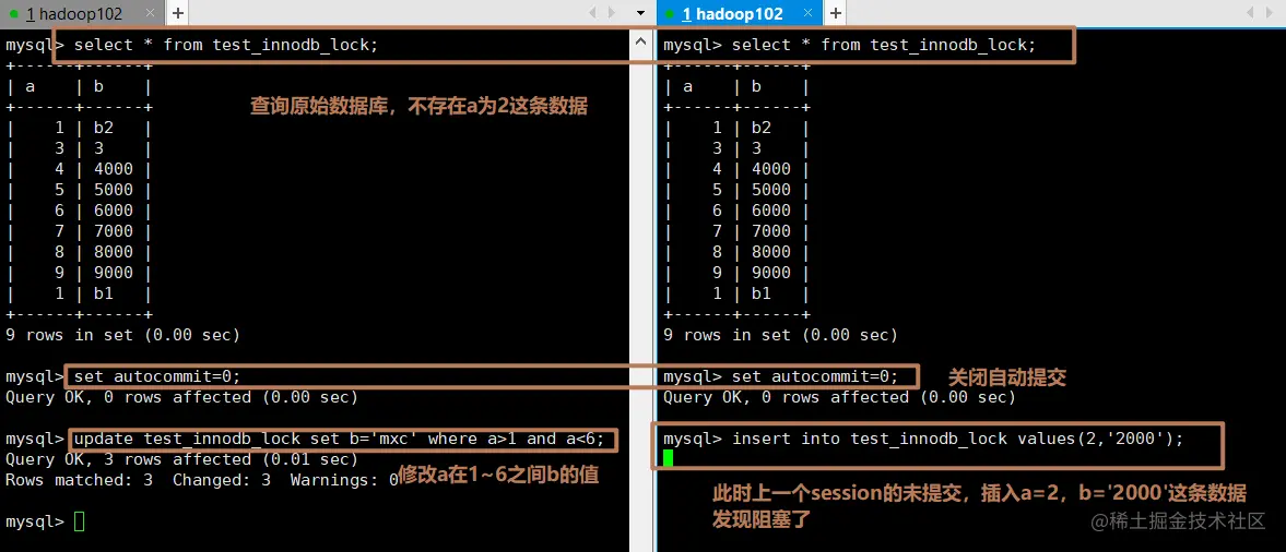 操作同一行数据时:当上一个事务修改未提交时,第二个事务也去修改会处于阻塞。