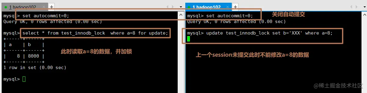 select xxx ... for update 锁定某一行后,其它的操作会被阻塞,直到锁定行的会话提交commit。