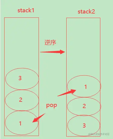 //将 stack1 出栈的元素再推入 stack2,实现逆序