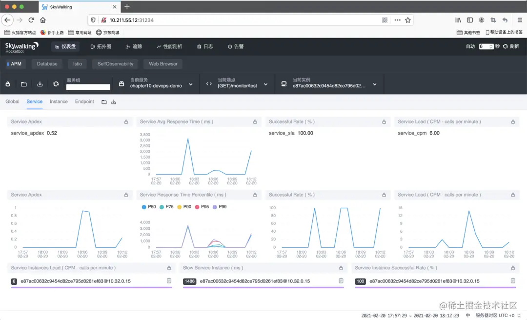 运行成功了!此时可以访问下服务的测试接口,多刷几次,之后通过SkyWalking UI查看是否有监控数据,如下图所示: