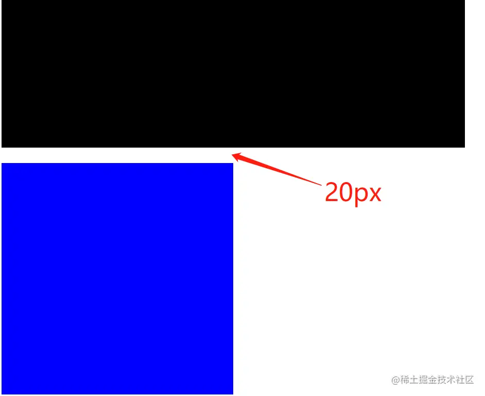 效果如图,蓝黑两个元素设置了margin-top和bottom后,间距并不是10+20 = 30px,其实是取了两者之间较大者,margin-top = 20px