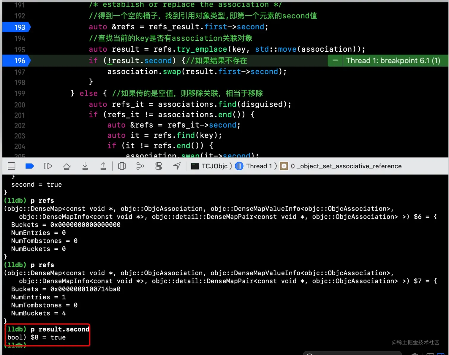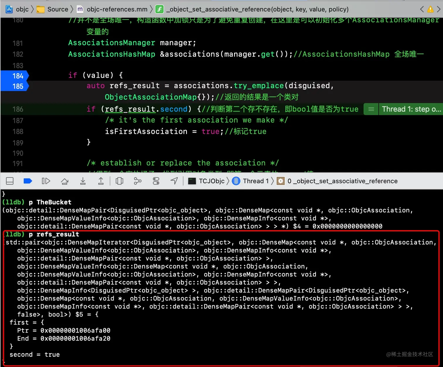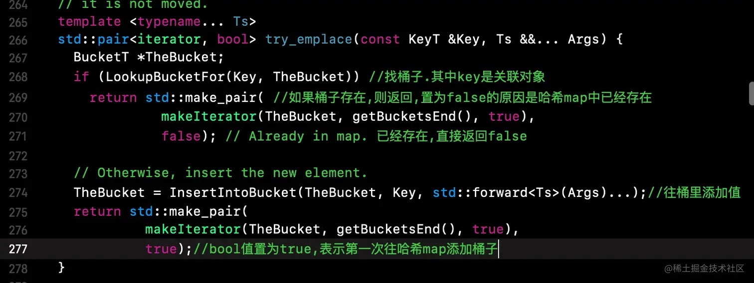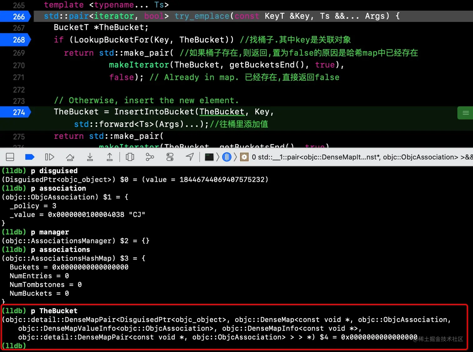 第一次执行try_emplace插入的是一个空桶,还没有值,第二次执行try_emplace才插入值,即往空桶中插入ObjectAssociationMap(value,policy),返回true,可以通过调试验证.