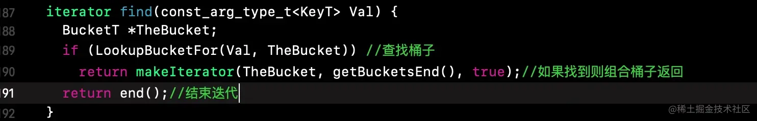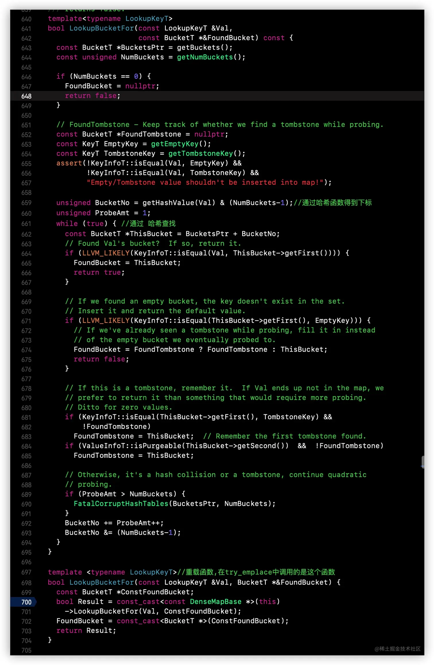 进入LookupBucketFor源码,有两个同名方法,其中第二个方法属于重载函数,区别于第一个的是第二个参数没有const修饰,通过调试可知,外部的调用是调用的第二个重载函数,而第二个LookupBucketFor方法,内部的实现是调用第一个LookupBucketFor方法