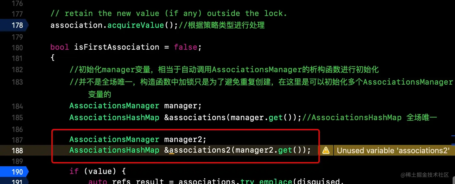 AssociationsManager类型的变量,相当于自动调用AssociationsManager的析构函数进行初始化- 加锁