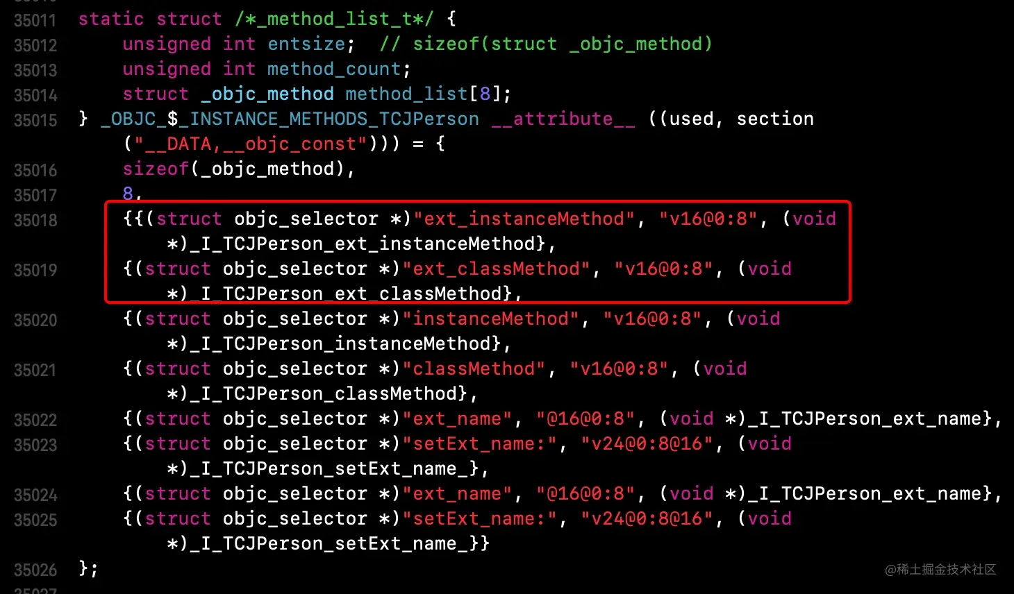 TCJPerson类扩展的方法,在编译过程中,方法就直接添加到了methodlist中,作为类的一部分,即编译时期直接添加到本类里面
