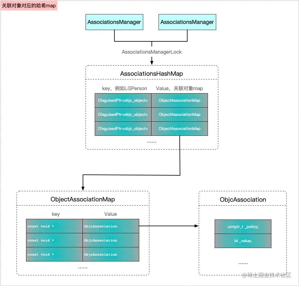 其中AssociationsManager可以有多个,通过AssociationsManagerLock锁可以得到一个AssociationsHashMap类型的map.