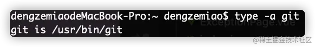 $ type -a git,发现在/usr/local/bin/git中也安装了一个git(细节:/usr/bin与/usr/local/bin这两个文件的性质是一样的,只是前者在后面被苹果限制了访问权限,不允许用户操作了,也就是个人用户只能操作后者,所以安装的就放到后者中了) -