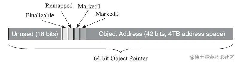 Colored Pointer, 即颜色指针,如图所示, ZGC 的核心设计之一。以前的垃圾收集器的GC 信息都保存在对象头中,而 ZGC 的 GC 信息保存在指针中。
