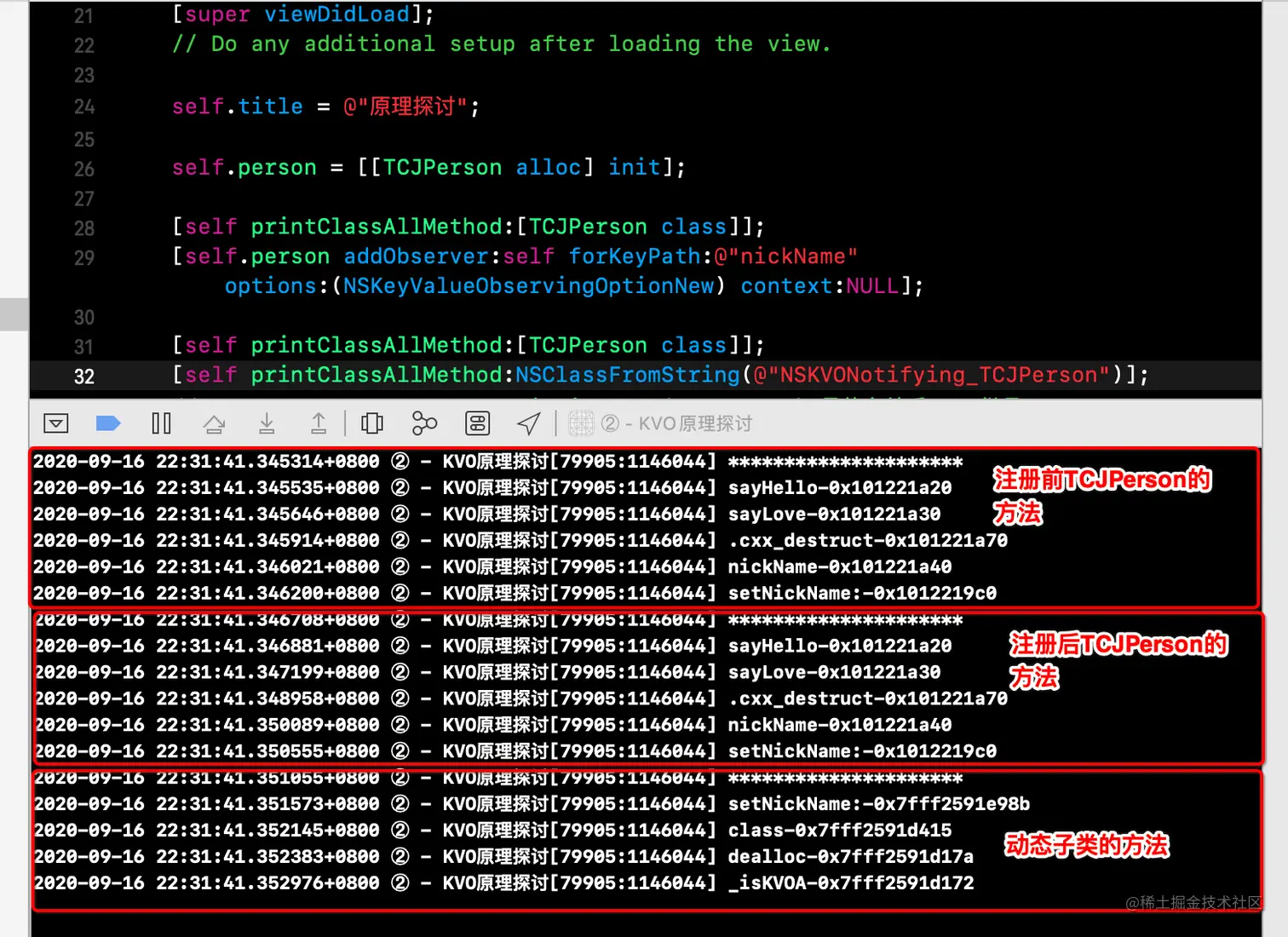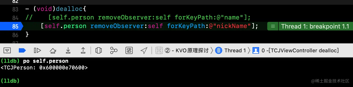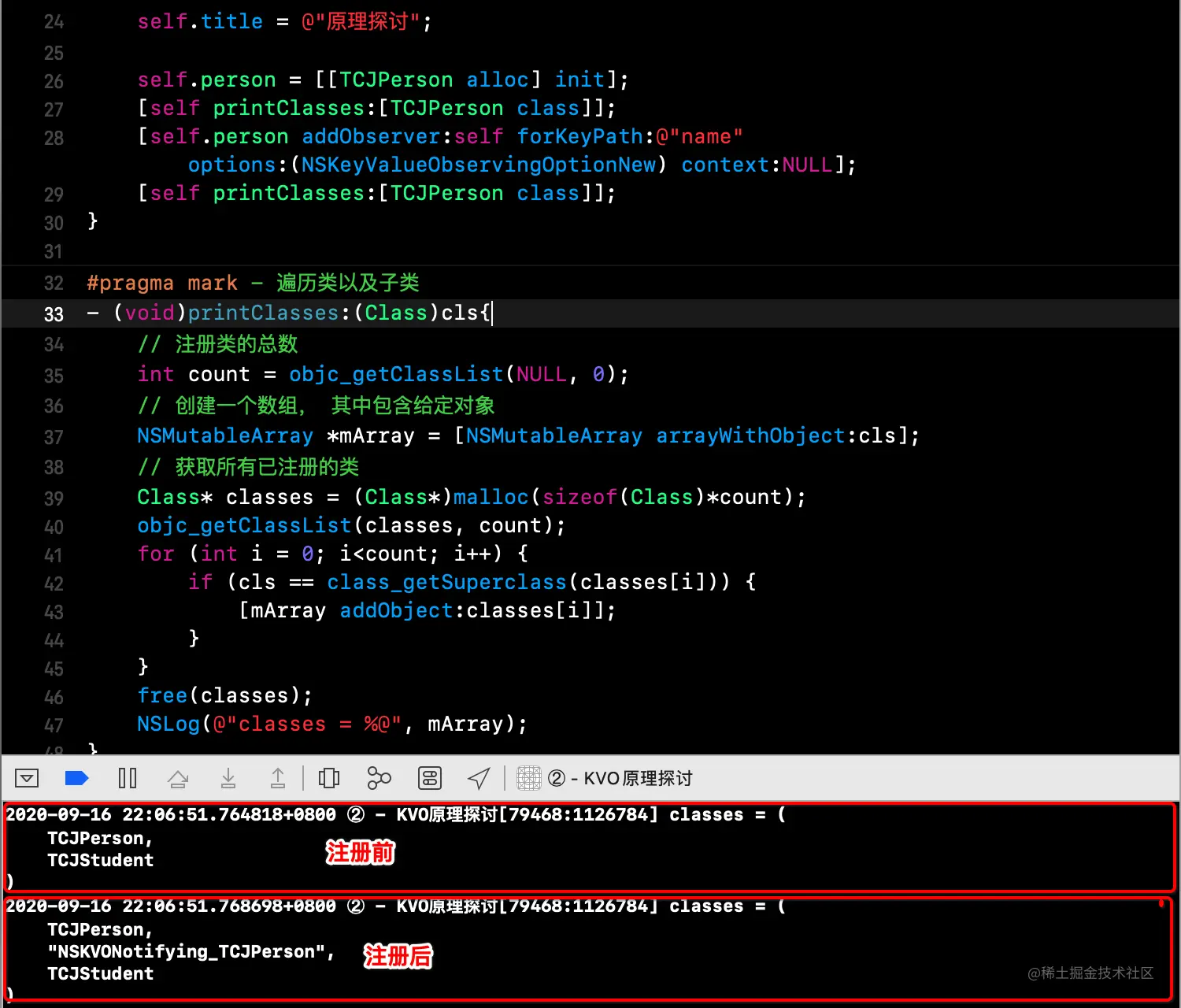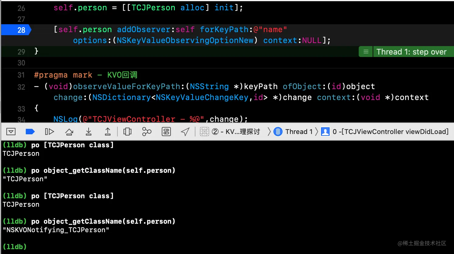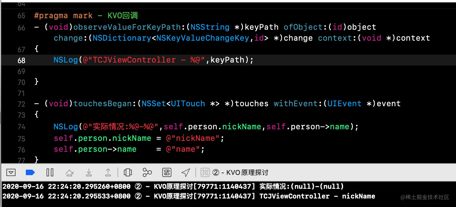 //定义context static void *PersonNameContext = &PersonNameContext; static void *StudentNameContext = &StudentNameContext; //注册观察者 [self.person addObserver:self forKeyPath:@"name" options:(NSKeyValueObservingOptionNew) context:PersonNameContext]; [self.child addObserver:self forKeyPath:@"name" options:(NSKeyValueObservingOptionNew) context:StudentNameContext]; //KVO回调 - (void)observeValueForKeyPath:(NSString *)keyPath ofObject:(id)object change:(NSDictionary<NSKeyValueChangeKey,id> *)change context:(void *)context { if (context == PersonNameContext) { NSLog(@"%@", change); } else if (context == StudentNameContext) { NSLog(@"%@", change); } }