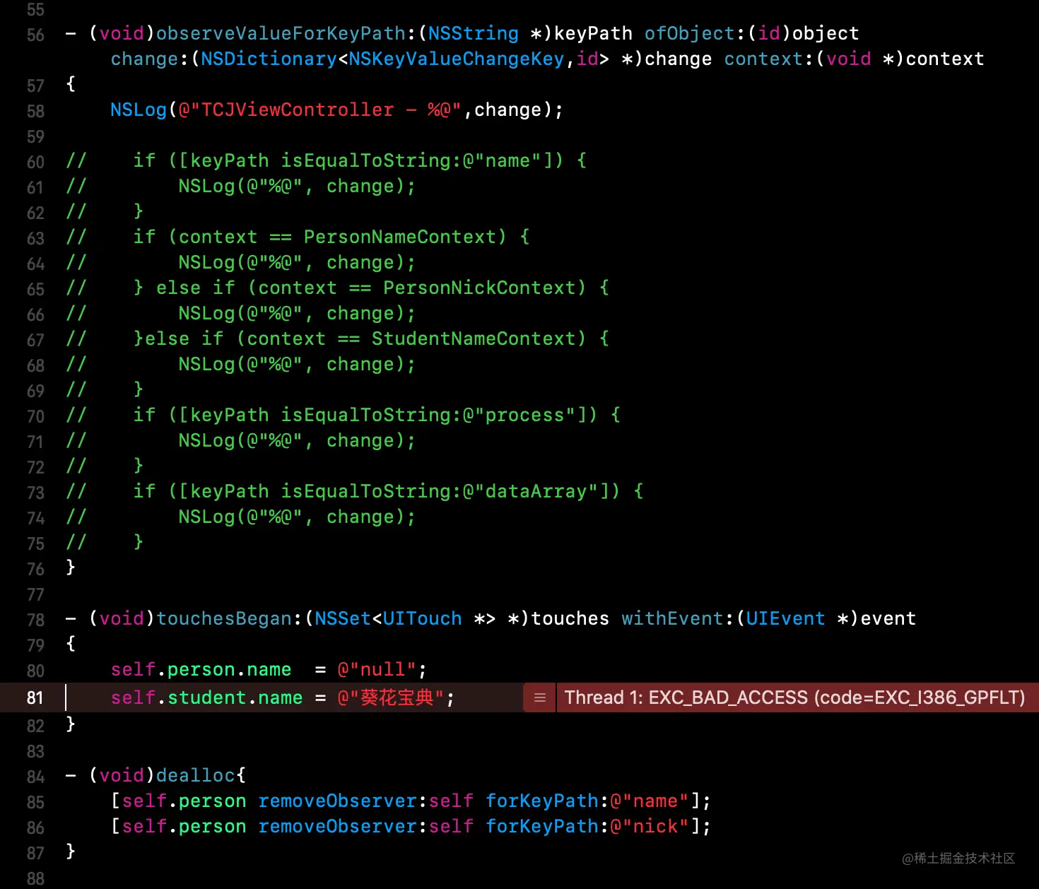 context作为观察值// context是 void * 类型,应该填 NULL 而不是 nil [self.person addObserver:self forKeyPath:@"name" options:(NSKeyValueObservingOptionNew) context:NULL]; -