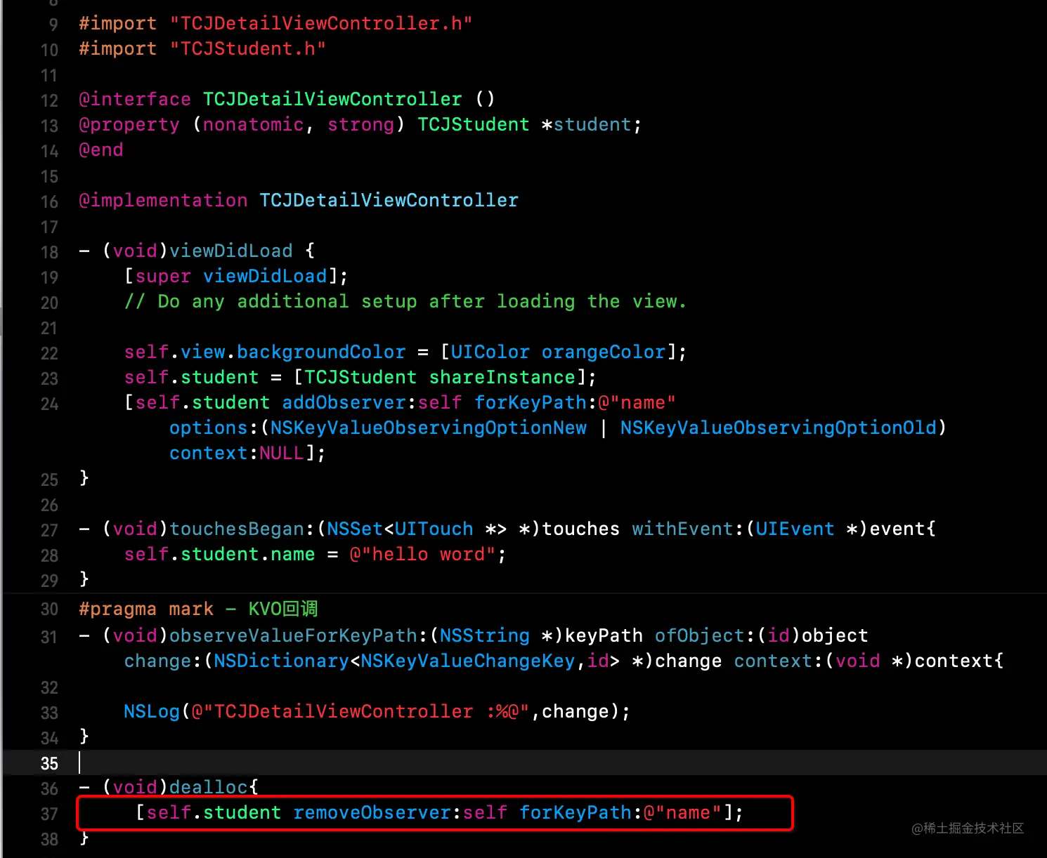 automaticallyNotifiesObserversForKey返回NO(可以只对某个属性设置)-- 自动开关,返回NO,就监听不到,返回YES,表示监听+ (BOOL)automaticallyNotifiesObserversForKey:(NSString *)key { if ([key isEqualToString:@"name"]) { return NO; } return [super automaticallyNotifiesObserversForKey:key]; } -