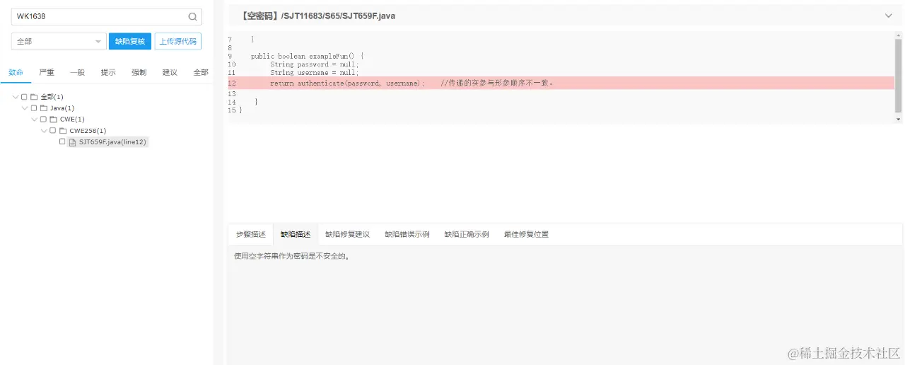 用Wukong软件检测上述程序代码,则可以发现代码中存在着“空密码” 导致的代码缺陷,如下图: