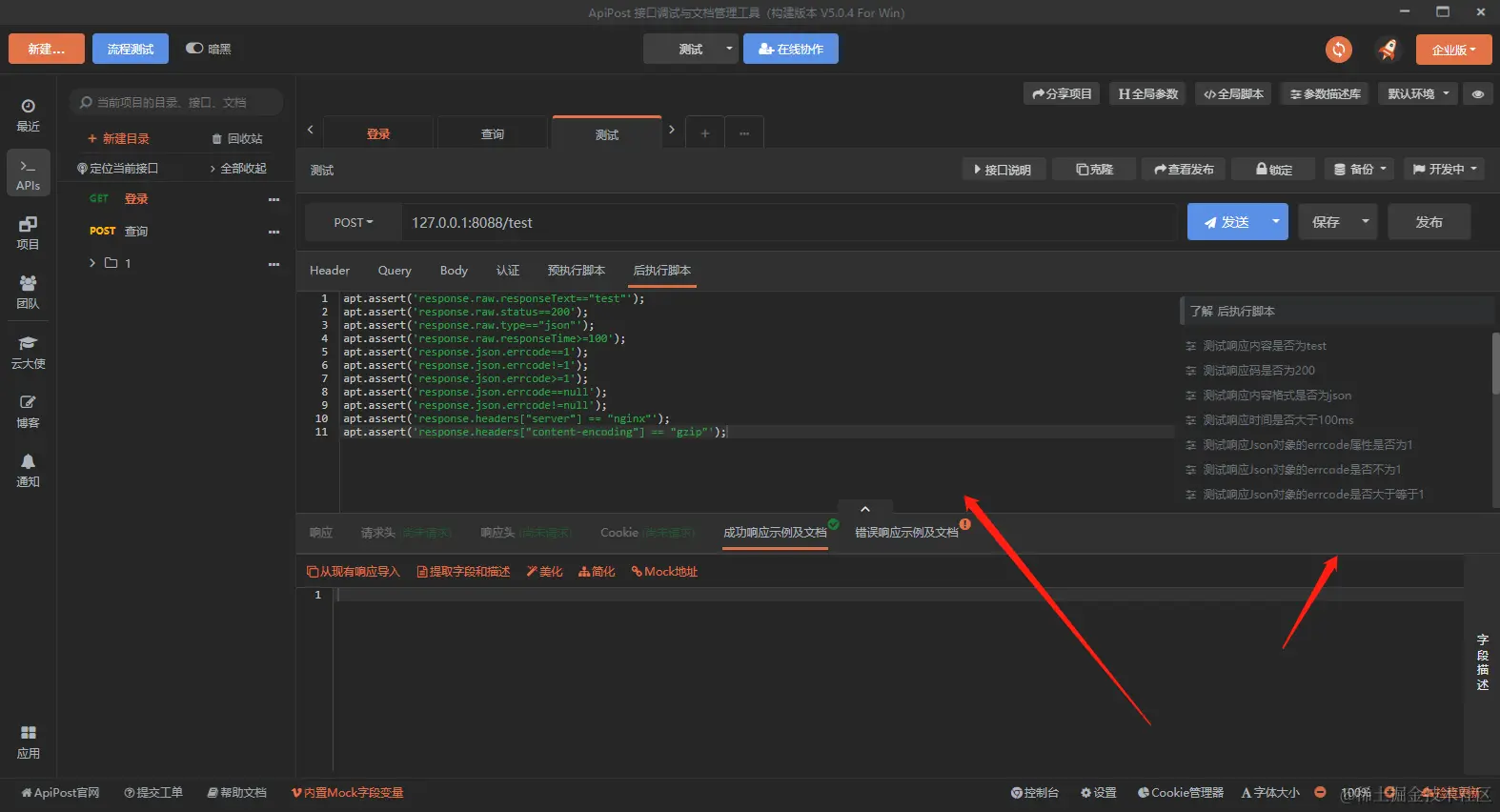 apipost的断言设置实在后执行脚本中进行编写的。apipost本身提供了11中断言:
