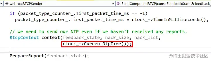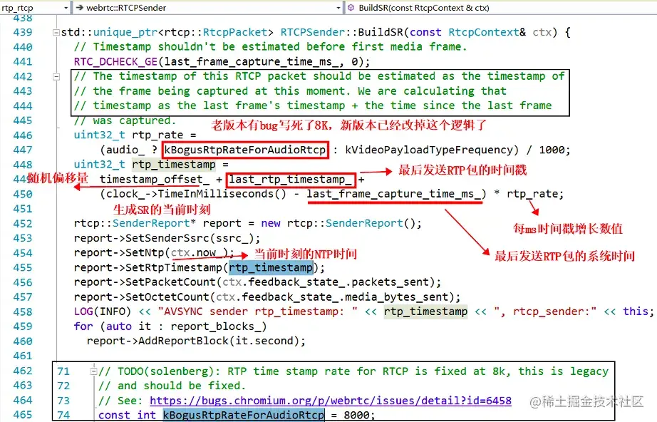 由上面论述可知,NTP 时间和 RTP 时间戳是同一时刻的不同表示,只是精度和单位不一样。NTP 时间是绝对时间,以毫秒为单位,而 RTP 时间戳则和媒体的采样频率有关,是一个单调递增数值。生成 SR 包的过程在 RTCPSender::BuildSR(const RtcpContext& ctx) 函数里面,老版本里面有 bug,写死了采样率为 8K,新版本已经修复,下面截图是老版本的代码: