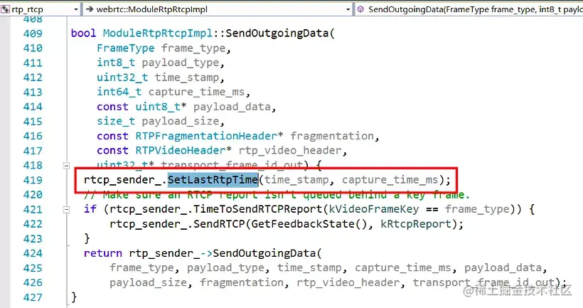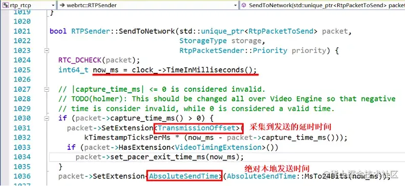 last_rtp_timestamp_ 和它的采集时刻的系统时间 last_frame_capture_time_ms_,和当前媒体流的时间戳的每 ms 增长速率 rtp_rate ,以及从 last_frame_capture_time_ms_ 到当前时刻的时间流逝,就可以算出来。注意,last_rtp_timestamp_ 是媒体流的原始时间戳,不是经过随机偏移的 RTP 包时间戳,所以最后又累加了偏移量 timestamp_offset_ 。其中最后一个发送的 RTP 包的时间信息是通过下面的函数进行更新的: