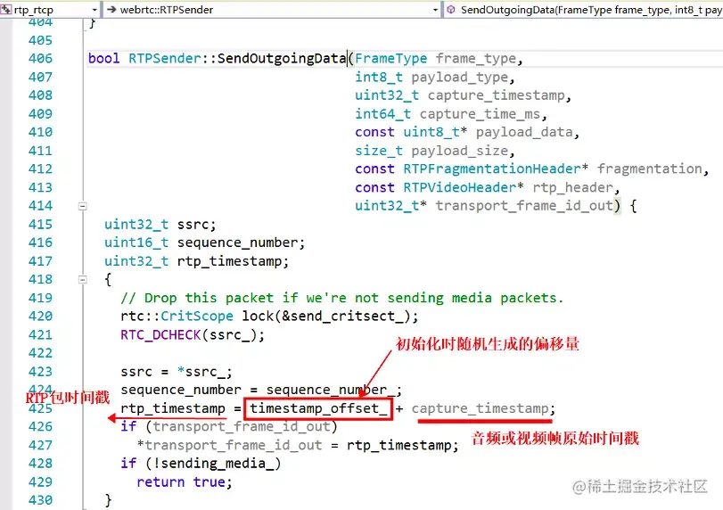 WebRTC 的音频帧的时间戳,从第一个包为 0,开始累加,每一帧增加 = 编码帧长 (ms) x 采样率 / 1000,如果采样率 16KHz,编码帧长 20ms,则每个音频帧的时间戳递增 20 x 16000/1000 = 320。这里只是说的未打包之前的音频帧的时间戳,而封装到 RTP 包里面的时候,会将这个音频帧的时间戳再累加上一个随机偏移量(构造函数里生成),然后作为此 RTP 包的时间戳,发送出去,如下面代码所示,注意,这个逻辑同样适用于视频包。