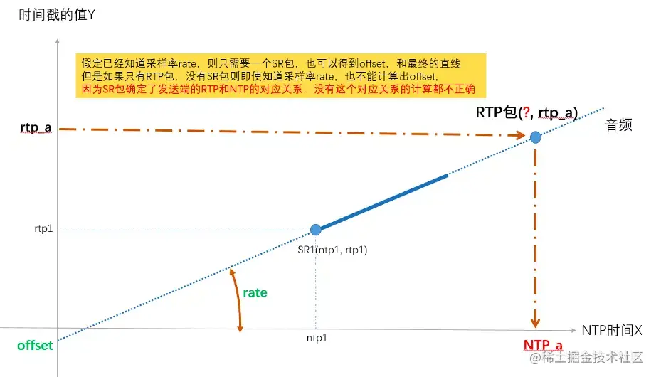 上图以音频的两个 SR 包为例,确定出了 RTP 和 NTP 对应关系的直线,然后给任意一个 rtp_a,就算出了其对应的 NTP_a,同理也可以求任意视频包 rtp_v 对应的 NTP_v 的时间点,两个的差值就是时间差。
