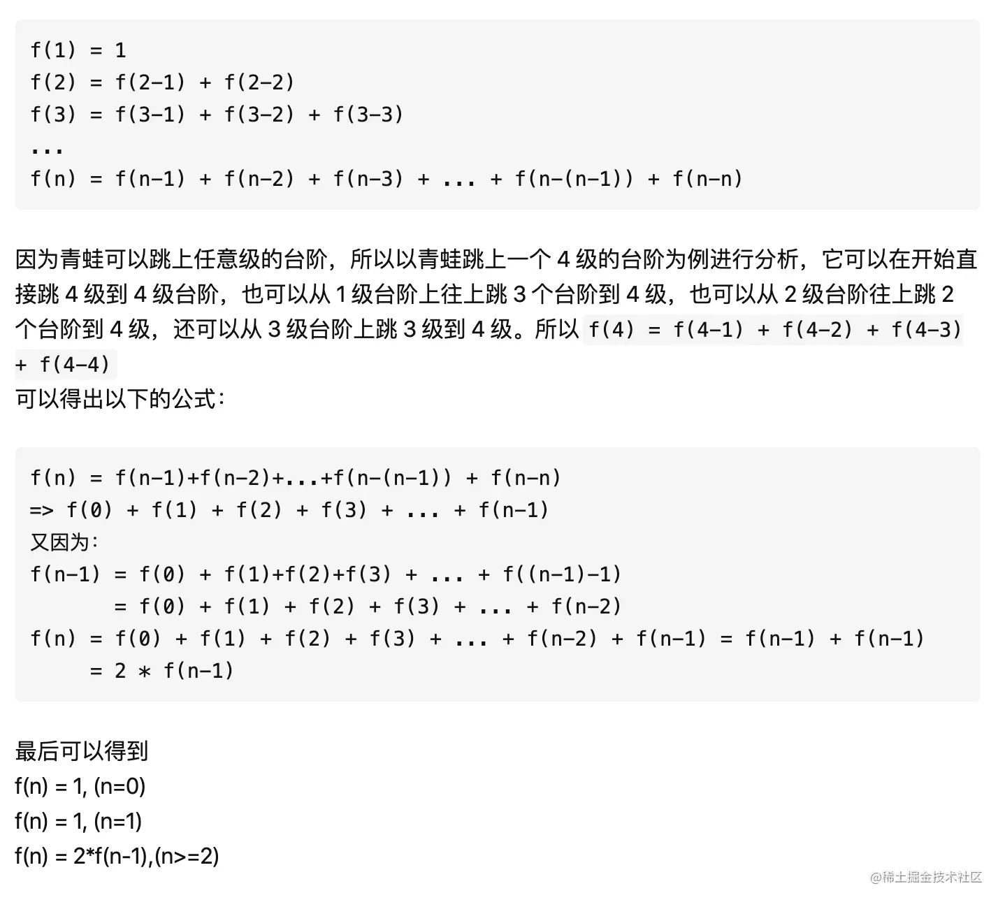 - 一只青蛙一次可以跳上1级台阶,也可以跳上2级……它也可以跳上n级。求该青蛙跳上一个n级的台阶总共有多少种跳法。