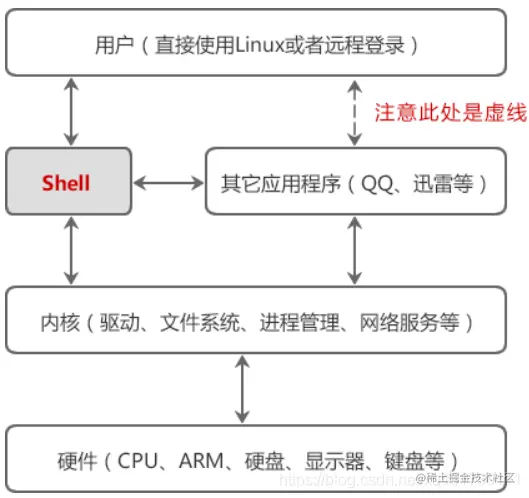 Shell 本身并不是内核的一部分,它只是在内核的基础上编写的一个应用程序,它和 QQ、迅雷、Firefox 等其它软件没有什么区别。然而 Shell 也有着它的特殊性,就是开机立马启动,并呈现在用户面前;用户通过 Shell 来使用 Linux,不启动 Shell 的话,用户就没办法使用 Linux。