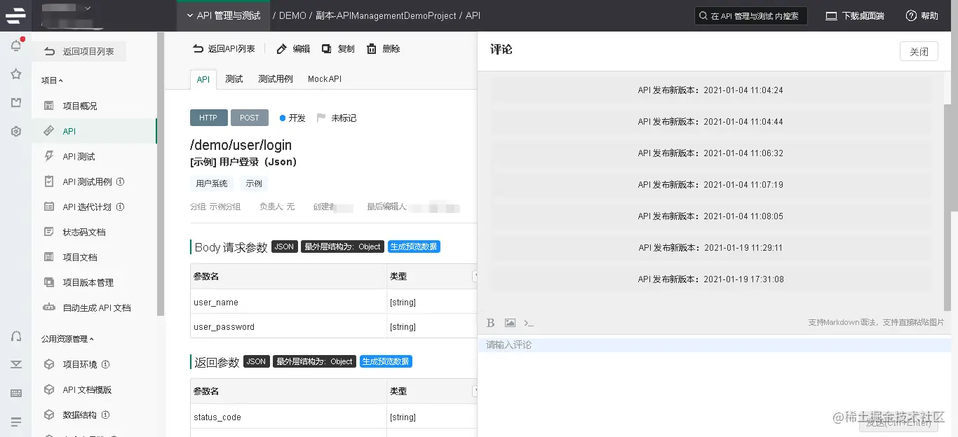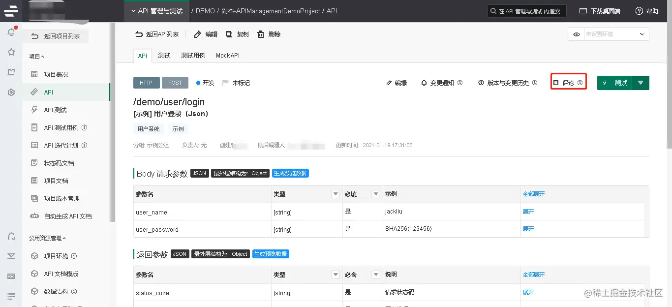 Eolinker评论可以作为API的标签,将问题和想法引起项目涉众的注意。登录系统后,在API文档详情中,单击右上角”评论”按钮,从评论栏添加评论。