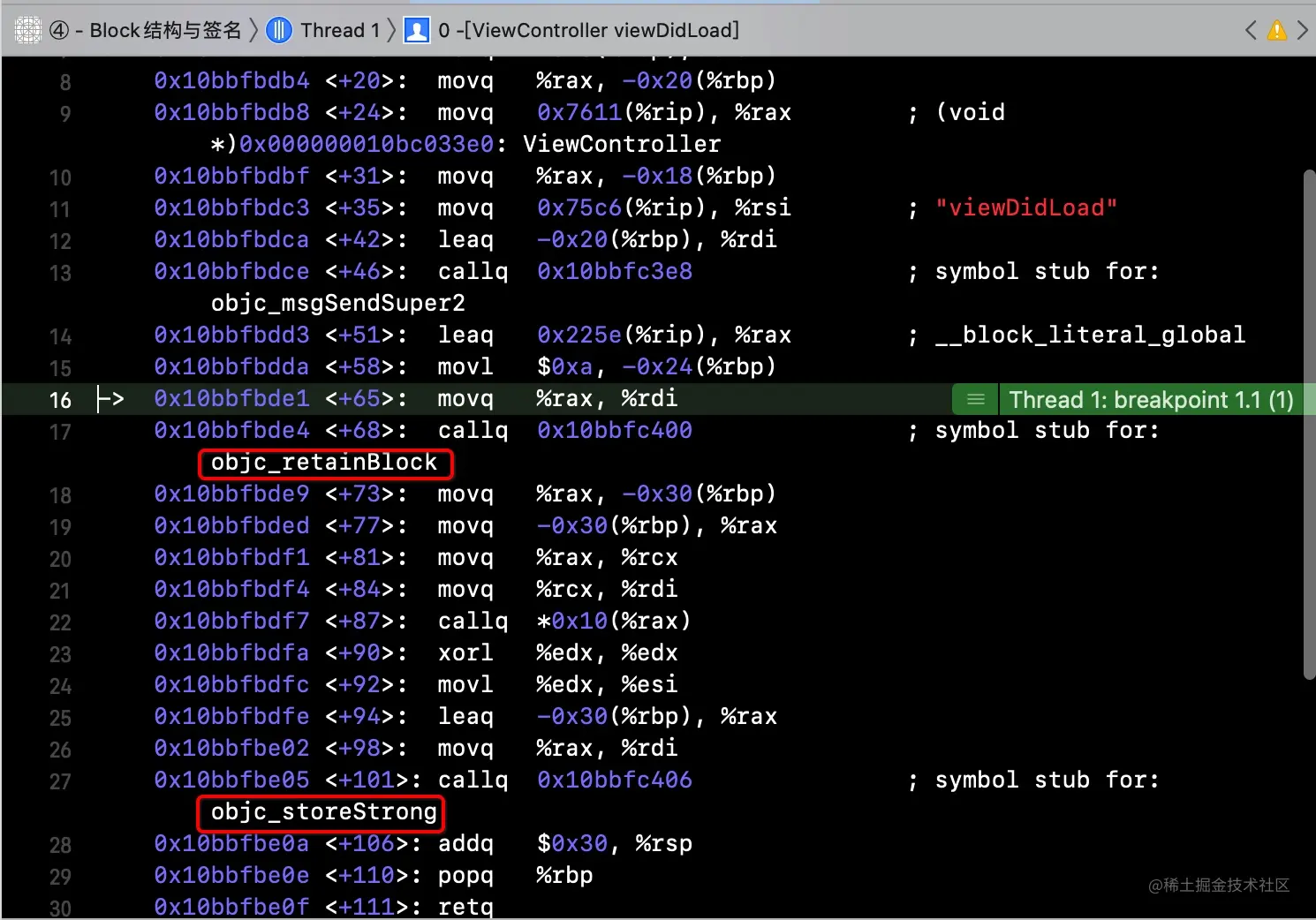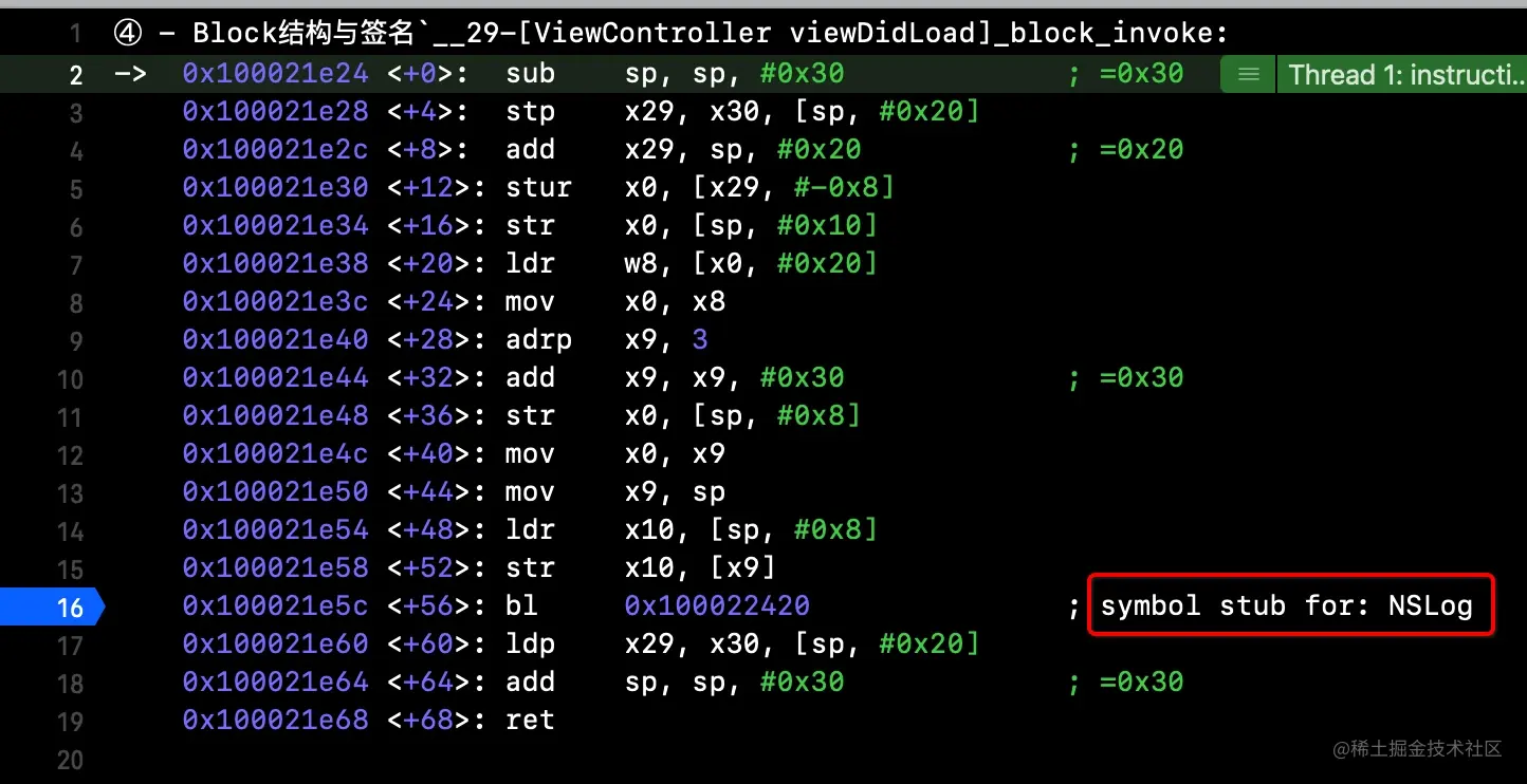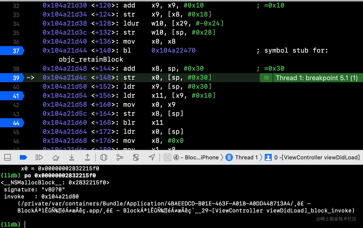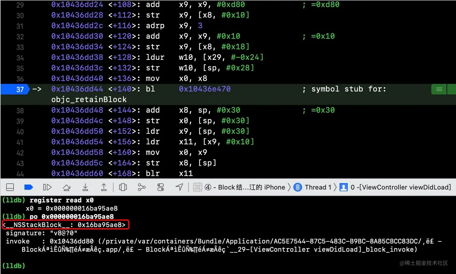 前面提到的Block_layout的结构体源码,从源码中可以看出,有个属性invoke,即block的执行者,是从isa的首地址平移 16字节取到invoke,然后进行调用执行的.