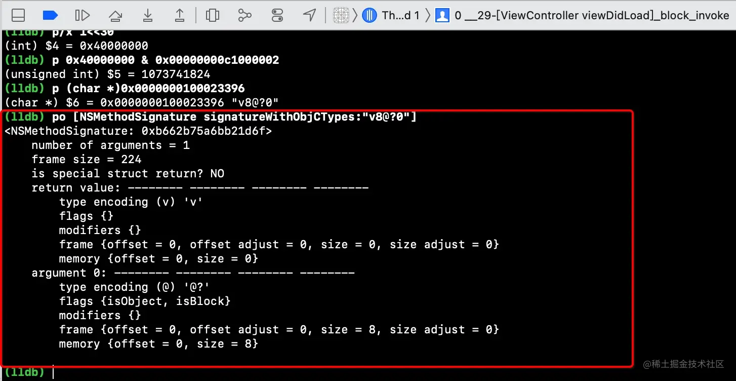 po [NSMethodSignature signatureWithObjCTypes:"v8@?0"],即打印签名
