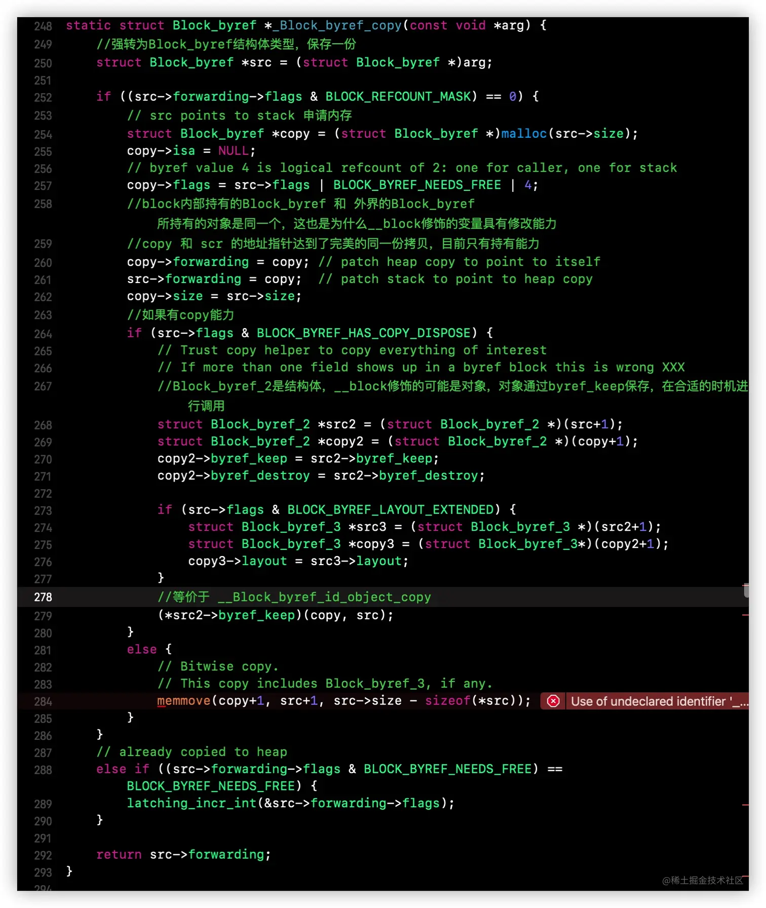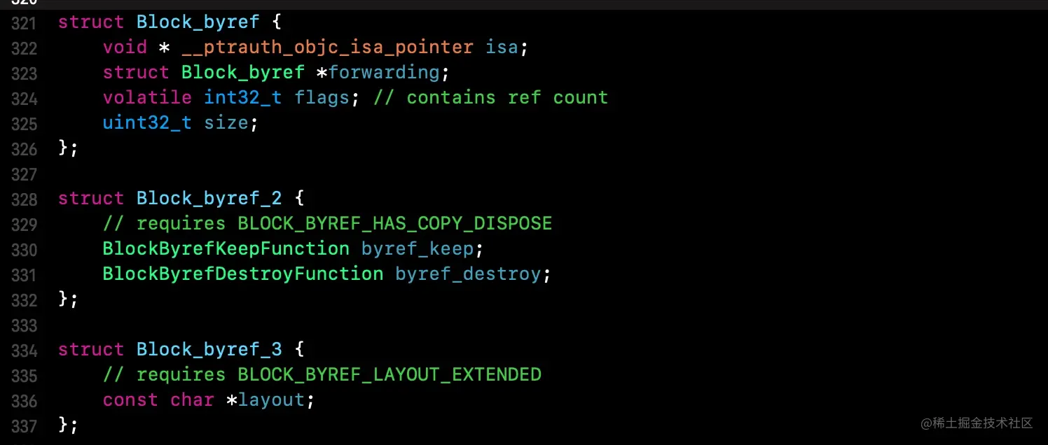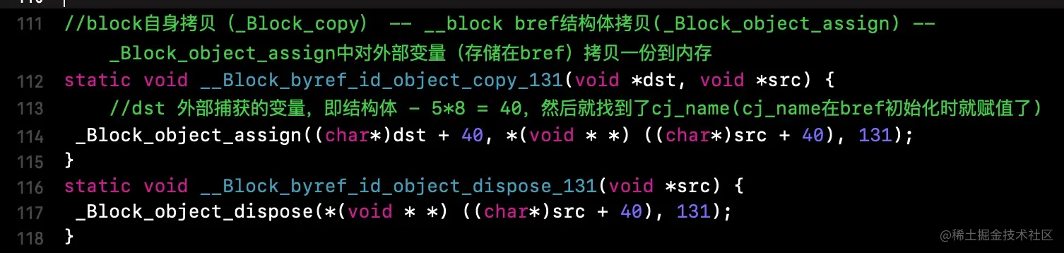 此时捕获到的变量是被__block修饰的BLOCK_FIELD_IS_BYREF类型,就会调用*dest = _Block_byref_copy(object);