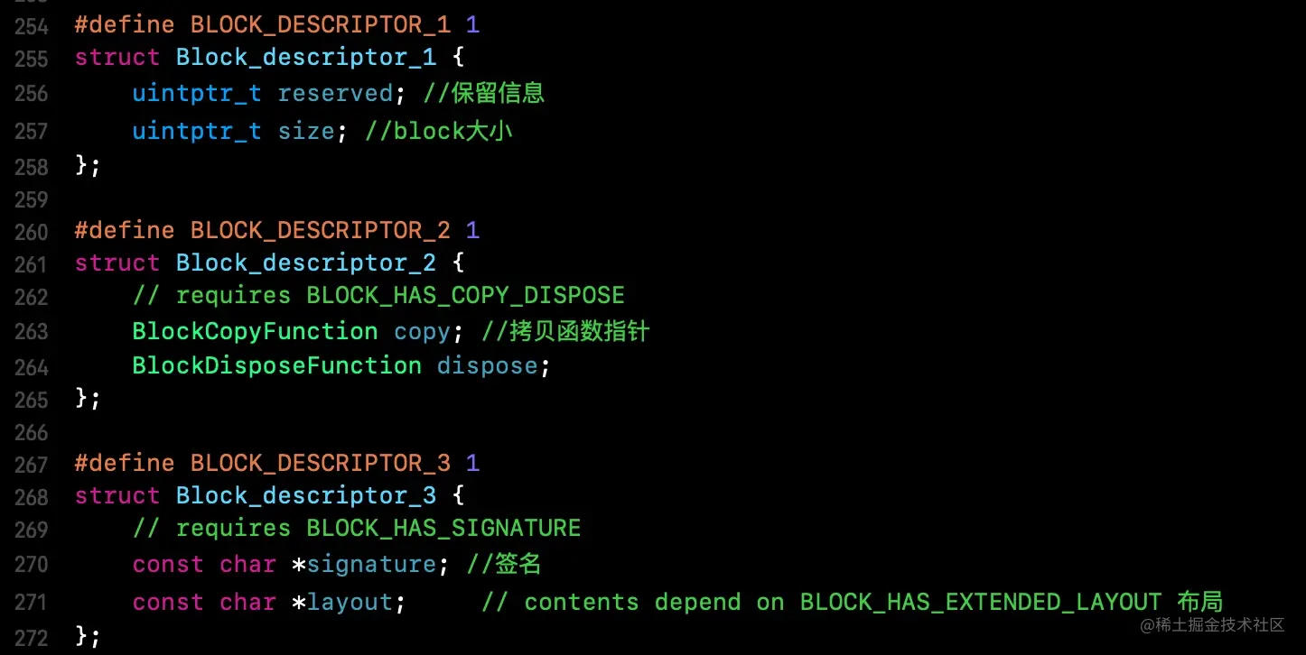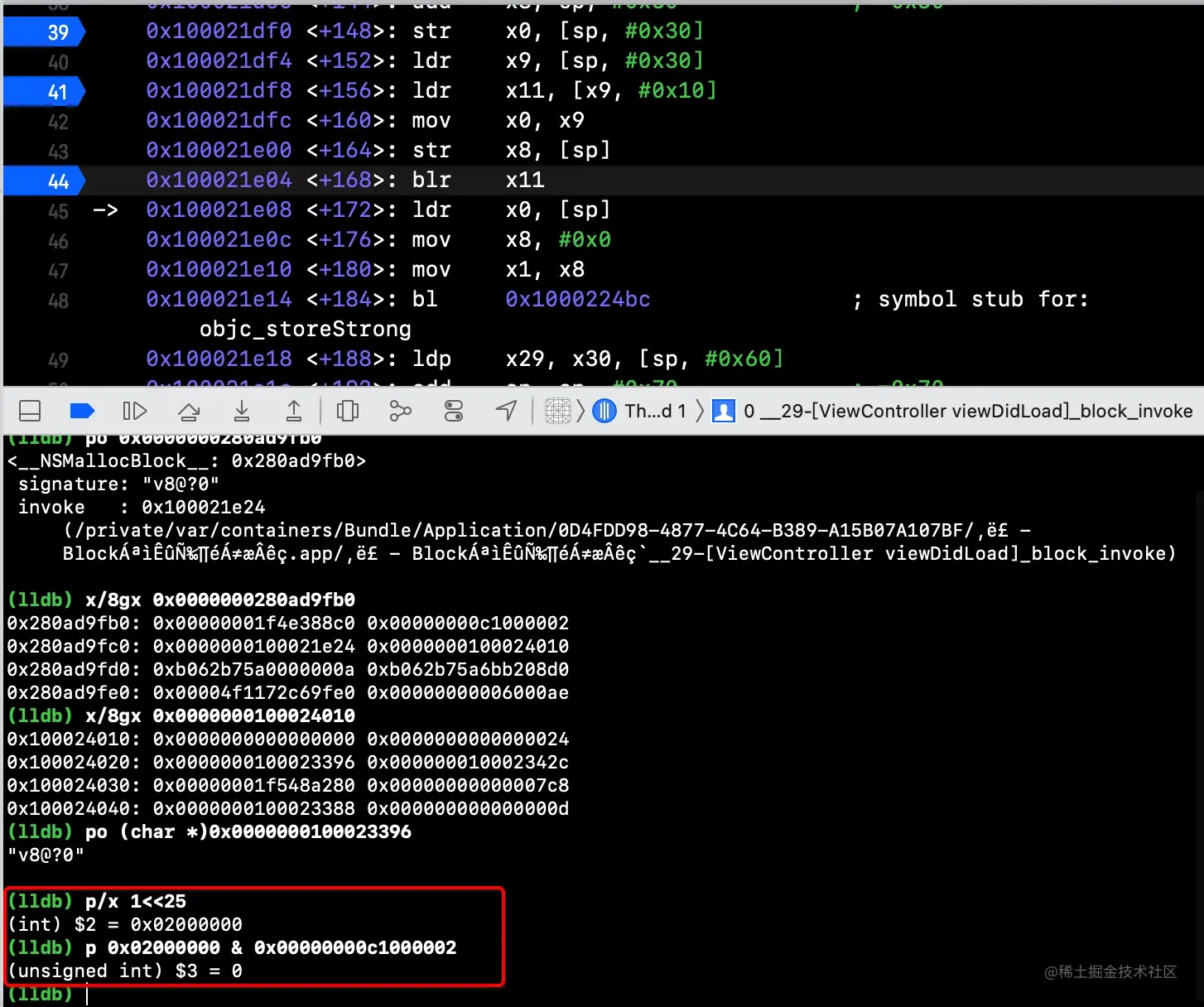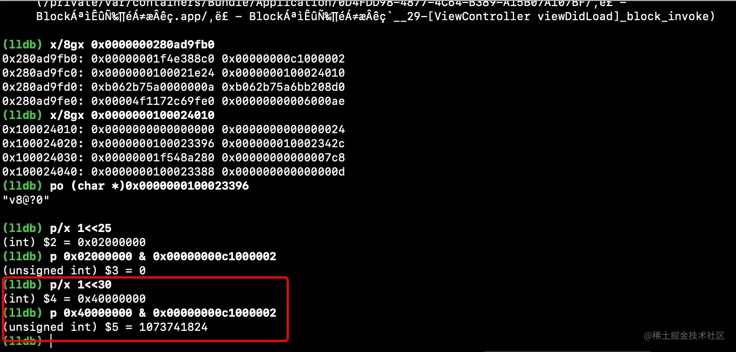 Block_descriptor_2,即flags的BLOCK_HAS_COPY_DISPOSE(拷贝辅助函数)是否有值p/x 1<<25,即1左移25位,其十六进制为0x2000000p 0x02000000 & 0x00000000c1000002,即BLOCK_HAS_COPY_DISPOSE & flags,等于0,表示没有Block_descriptor_2