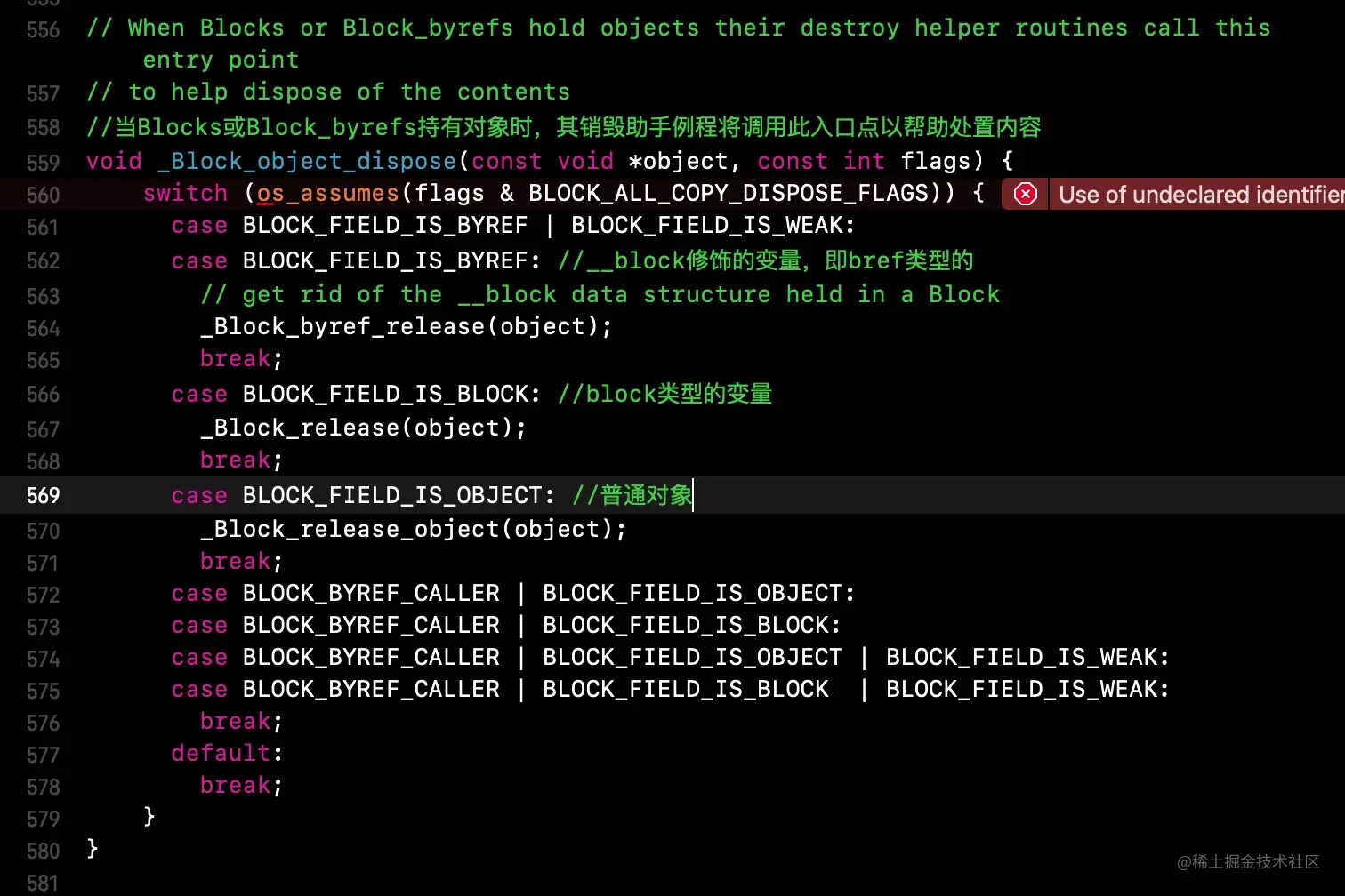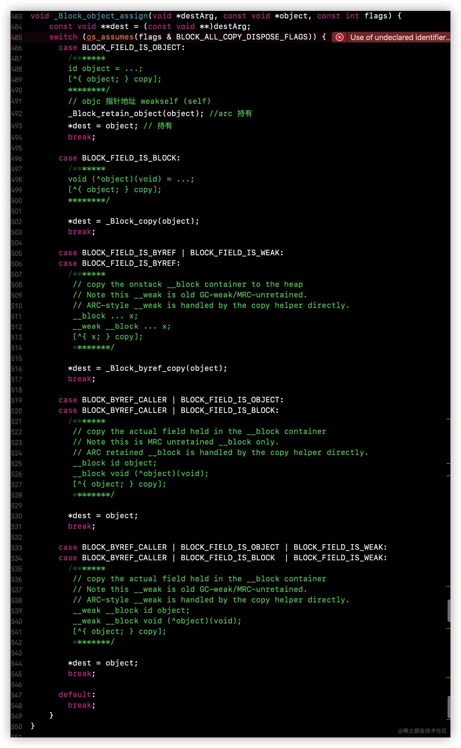 通过源码我们可以知道_Block_object_dispose是进行release操作,通过不同分区的block,进行不同的释放操作.而_Block_object_assign是进行retain操作的.