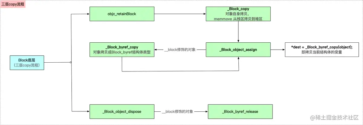 通过上面的分析,我们可以知道这些方法的执行顺序_Block_copy->_Block_byref_copy->_Block_object_assign,正好对应上述的三层copy