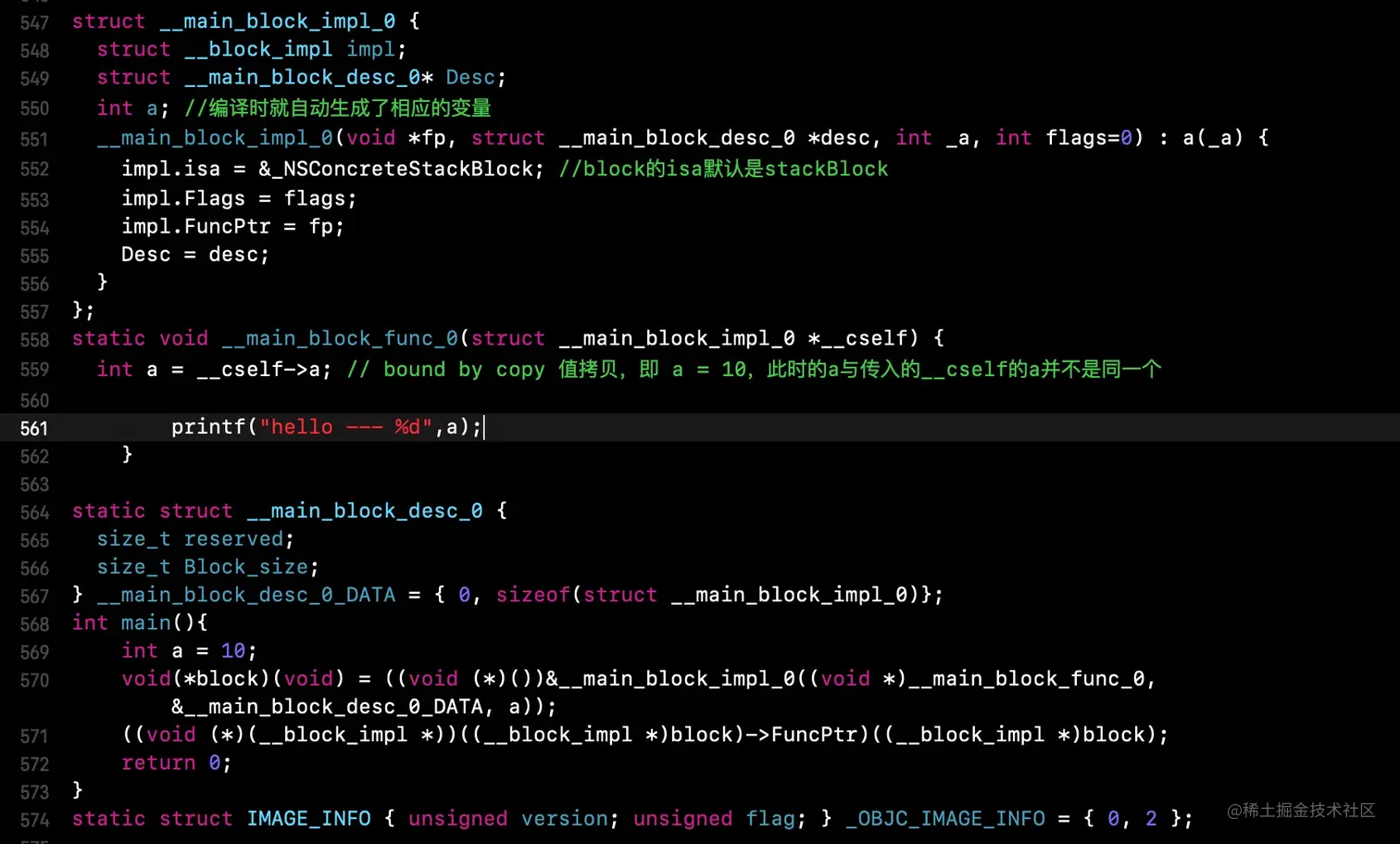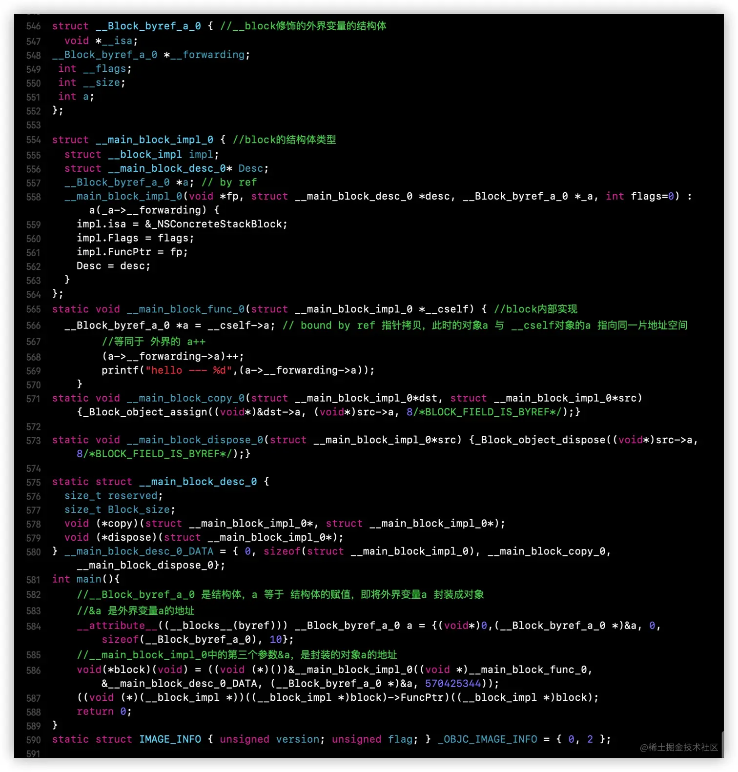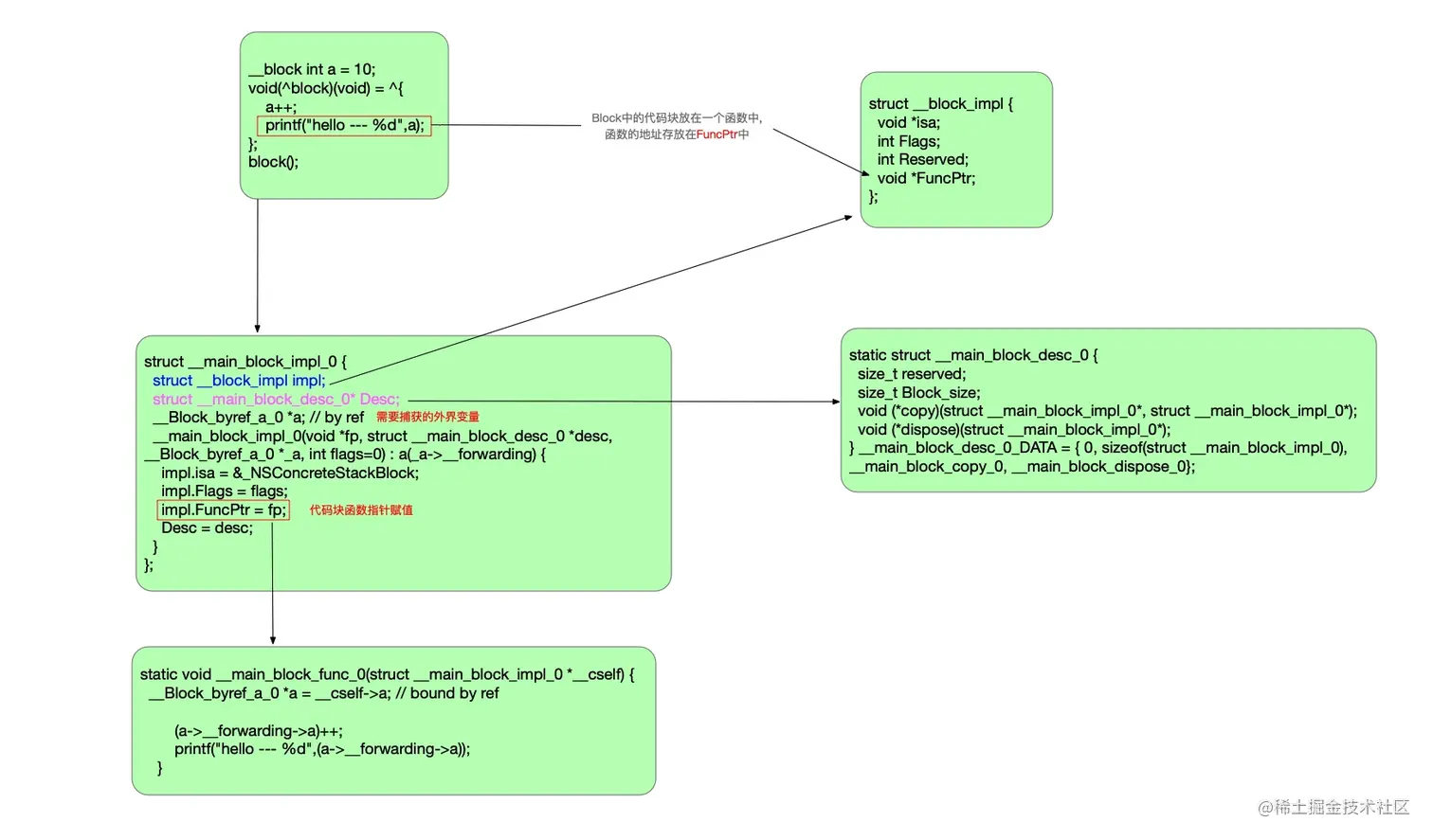 外界变量通过__block生成__Block_byref_a_0结构体结构体用来保存原始变量的指针和值- 将变量生成的