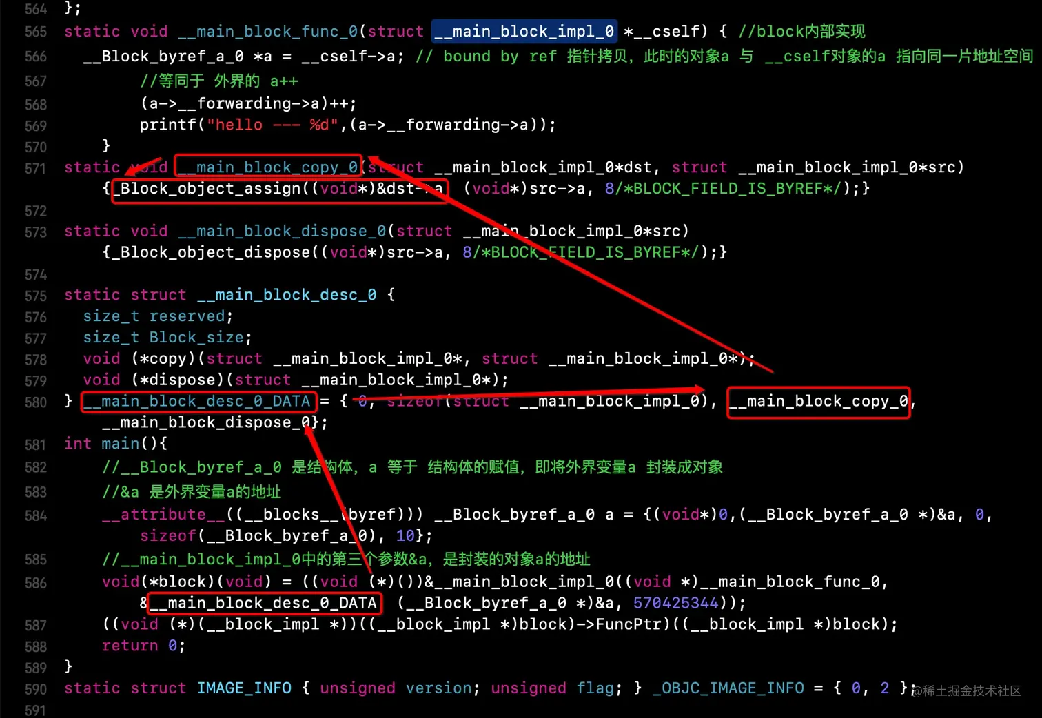 main中的a是通过外界变量封装的对象__main_block_impl_0中,将对象a的地址&a给构造函数- 在