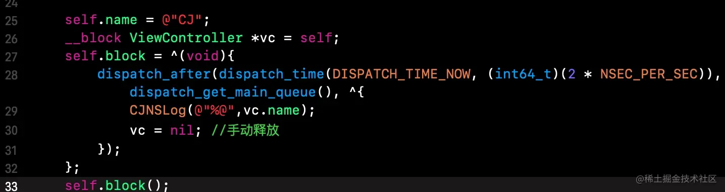 需要注意的是这里的block必须调用,如果不调用block,vc就不会置空,那么依旧是循环引用,self和block都不会被释放.