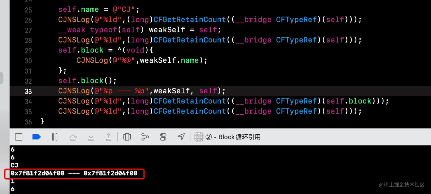 weakSelf和self指向同一片内存空间,且使用__weak不会导致self的引用计数发生变化,可以通过打印weakSelf和self的指针地址,以及self的引用计数来验证,如下所示 -