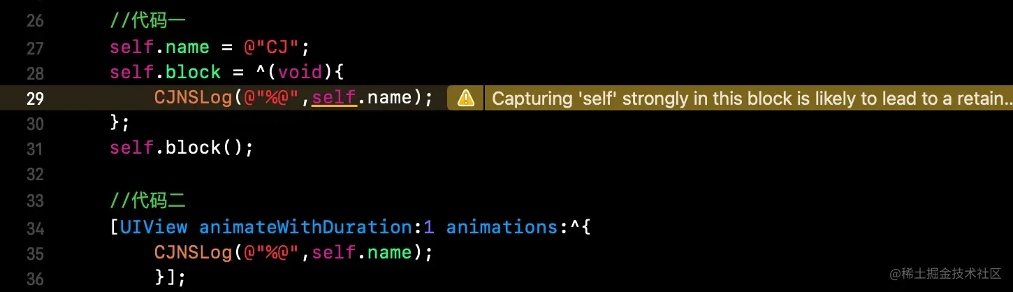生了循环引用,因为在block内部使用了外部变量name,导致block持有了self,而self原本是持有block的,所以导致了self和block的相互持有. - 代码二中